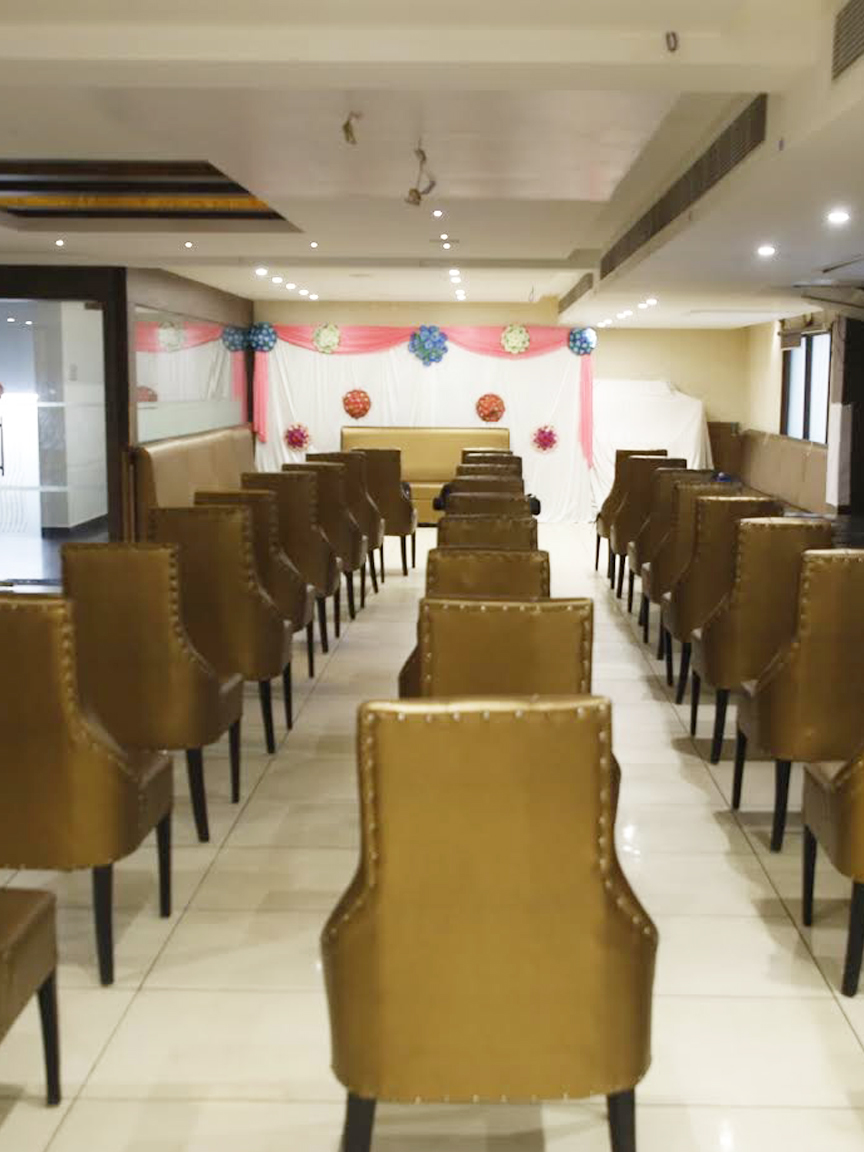 Our PARTY HALL is Centralised Air-conditioned and has the capacity to be transformed into the perfect destination to host Engagements, Birthday Parties, Corporate Events, Business Meetings and Small Scale Weddings that accommodate up to 150 guests with ease. It is situated on the ground floor. The warm hospitality and banqueting services of our team makes the execution of the event flawless. A large number of corporate entities come to experience our professional services.
